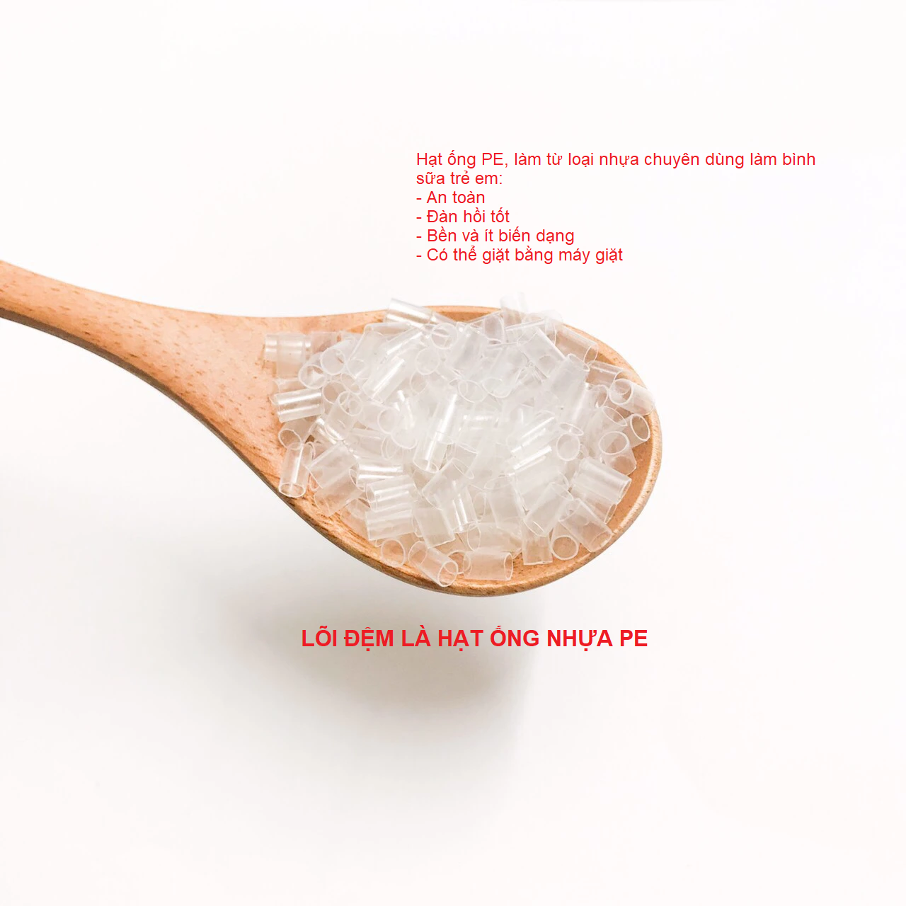 - Chất liệu lõi: là hạt ống nhựa PE 100% cao cấp(loại lựa dùng làm bình sữa trẻ em) an toàn, thoát khí tốt, đàn hồi tốt.