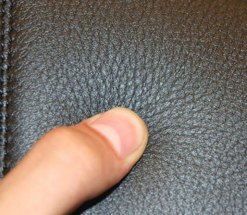 Dùng ngón cái và ấn mạnh lên bề mặt sản phẩm, nếu là da thật, sẽ để lại vết lõm xung quanh ngón tay cái của bạn. Tuy nhiên, khi bạn bỏ tay ra, vết lõm sẽ mất đi chứng tỏ độ đàn hồi của bề mặt da thật. Còn với da giả, các loại da tổng hợp sẽ không thể có được độ đàn hồi này.